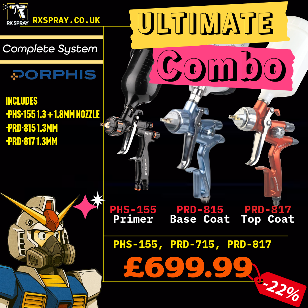 This powerful Trio offers the perfect partnership for high-quality paintwork. The PRD-817 is your go-to for crystal-clear top coat finishes, making it ideal for applying glass-like clear coats with precision and control using Porphis's flagship MP spray gun.